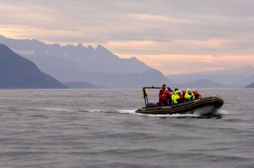 | Während der Reise entlang der norwegischen Küste werden diverse Landausflüge (von unterschiedlichem Reiz) angeboten. In Bodo unternehmen wir, (dick in Überlebensanzüge eingepackt) einen sehr interessanten Zodiak-Ausflug durch verschiedene Fjorde und zu dem Gezeitenstrom "Saltstraumen". Der lohnt sich aber bestimmt mehr bei Gezeitenwechsel, da die großen Wasserstrudel natürlich nur auftreten, wenn bei Wechsel von Ebbe nach Flut oder umgekehrt ungeheuere Wassermassen durch eine enge Stelle in den Fjord gepresst werden oder ins Meer gesogen werden. | |