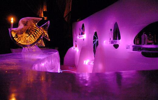 | In Svolvaer haben findige Jungunternehmer ein Eismuseum eröffnet. Wer möchte, kann sich einen Schnaps aus einem vergänglichen Glas aus Eis genehmigen. | |