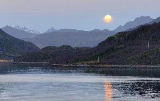| Als krönender Abschluß überrascht uns der aufgehende Mond bei der Ausfahrt aus dem Trollfjord. | |