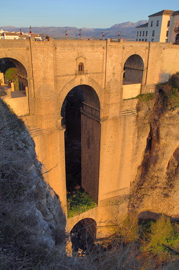 | Die Brücke von Ronda. Sie verbindet erst seit 1793 die Stadtteile von Ronda und überwindet die 150 m tiefe, messerscharfe Schlucht. Der Baumeister der Brücke kam durch einen Sturz von seiner Brücke ums Leben. Man erzählt, er habe Selbstmord begangen, weil er ein so perfektes Bauwerk nie wieder konstruieren könne. |