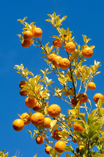 Andalusien ist berühmt für seine "Weißen Dörfer", malerisch in die Berge gebaute Siedlungen, deren weiß getünchte Häuser mit den roten Dächern sich kontrast-reich von der Umgebung abheben. Und Ronda ist idealer Ausgangspunkt für eine Tour zu den bekanntesten "Pueblos blancos". Also besorgte ich mir an der Rezeption des Paradors eine Karte und versehen mit wohlgemeinten Hinweisen machte ich mich auf den Weg in die Ronda umgebende Bergwelt. Bald führte mich meine Karte auf entlegene Nebenstrecken und am Wegrand wuchsen Apfelsinen. |