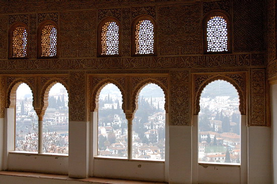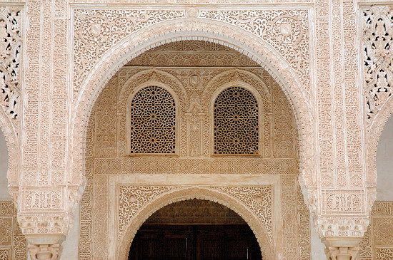 | Von außen erscheint die Alhambra wie ein Zweckbau, im Innern aber be-zeugen Säulen, Bögen und Ornamentik, Gärten und Wasserspiele den Höhe-punkt arabisch-andalusischer Baukunst. |