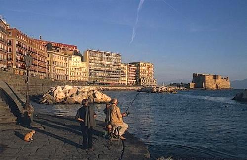 | Abendliches Dolce far niente 3 Männer und Katze vor der Kulisse Neapels |