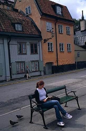 | Junge Leserin auf einer Bank und 2 Tauben |